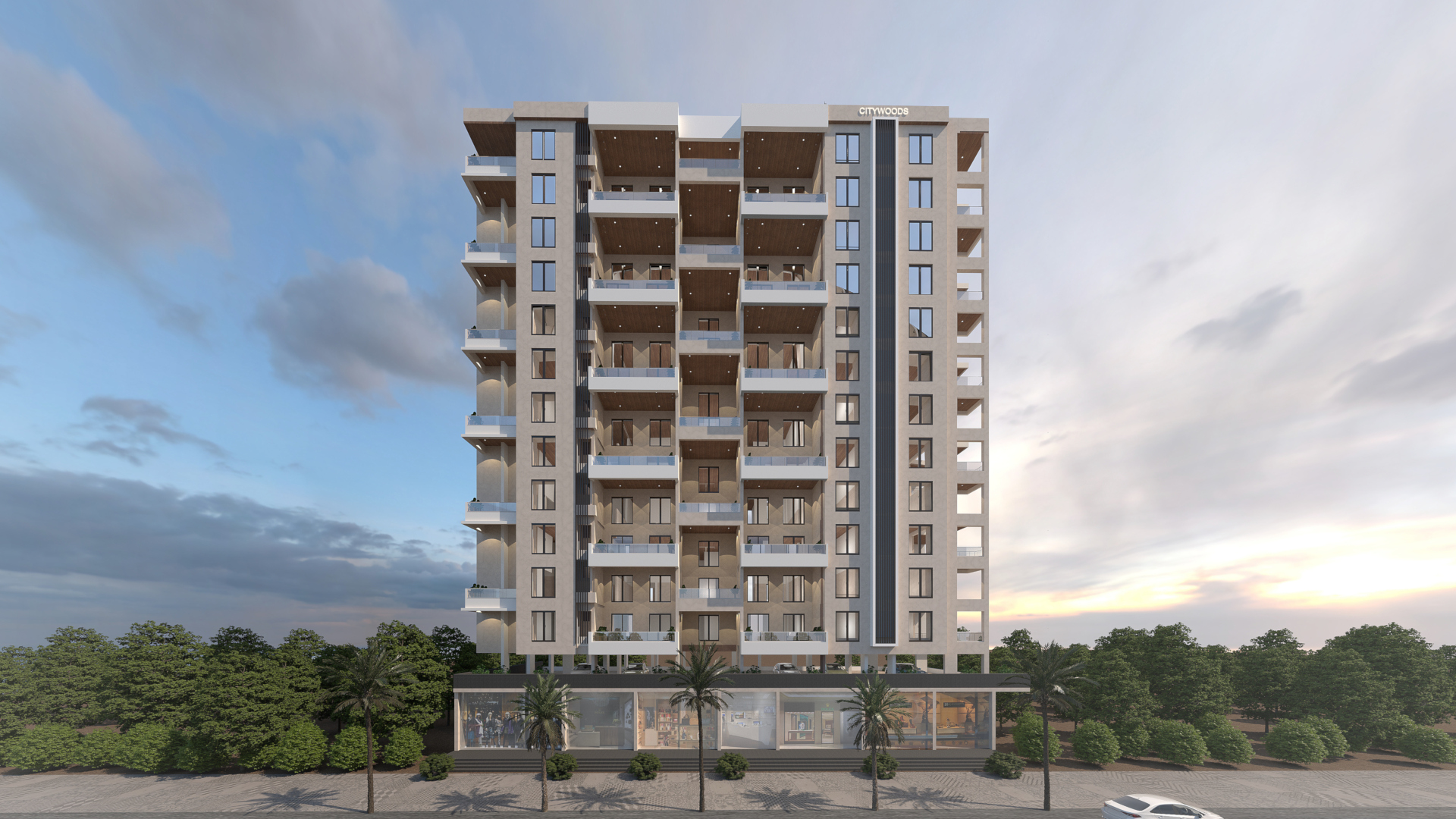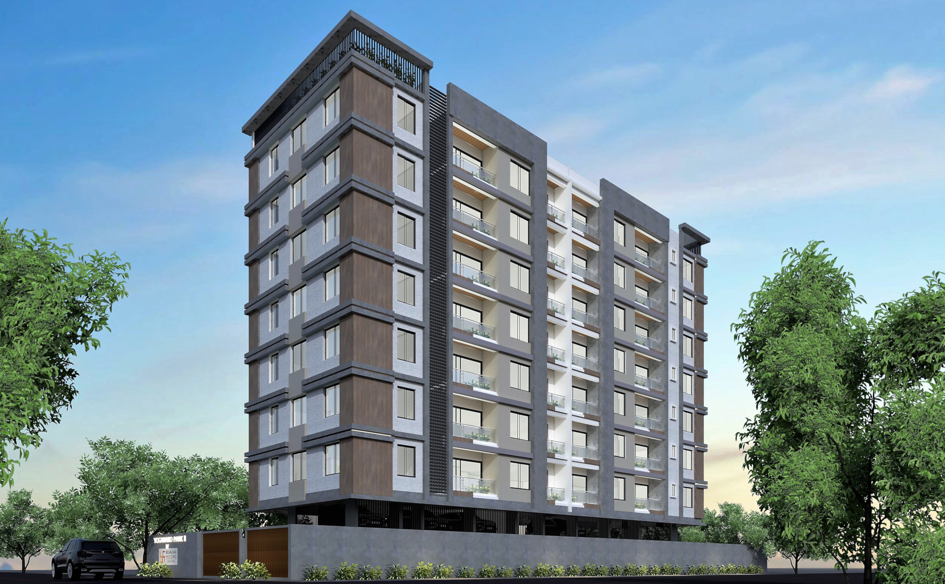Striking elevation design showcasing modern aesthetics for a multi-storey residential building